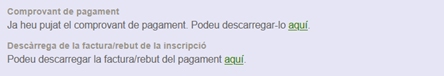 Quan ja s’hagi enviat el comprovant i, si escau,  s’hagin fet les oportunes comprovacions, la part inferior del requadre anterior s’haurà canviat per  unes línies que indicaran que ja s'ha efectuat el pagament i hi haurà un enllaç que indicarà que ja es podrà descarregar la factura/rebut.