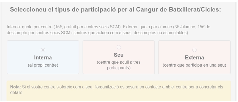 Es tracta de manifestar si el centre vol realitzar el cangur en el propi centre, si es pot oferir com a seu per a acollir concursants d’altres centres, o si opta per poder participar en el cangur en una seu externa amb alumnes d’altres centres.