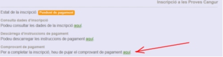 Quan ja s’hagi efectuat el pagament s’haurà de pujar un comprovant de pagament des de l’aplicatiu que s’obrirà amb l’enllaç que apareix a la part inferior del requadre que estem comentant.