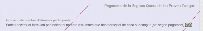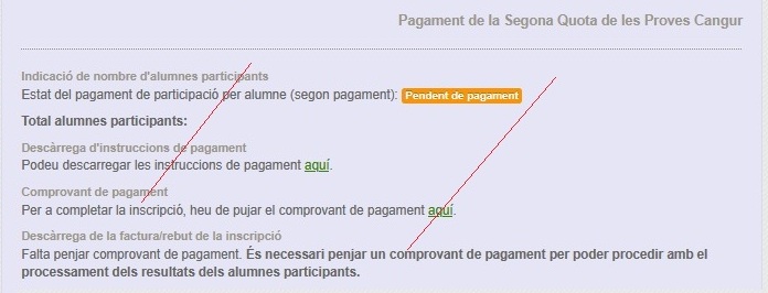 - Tot i que l'accés al l'aplicatiu corresponent s'ha de fer, preceptivament després de pujar el resguard de pagament l'enllaç està actiu, per raons tècniques. Tanmateix si no heu pujt abans el resguard us donarà error.