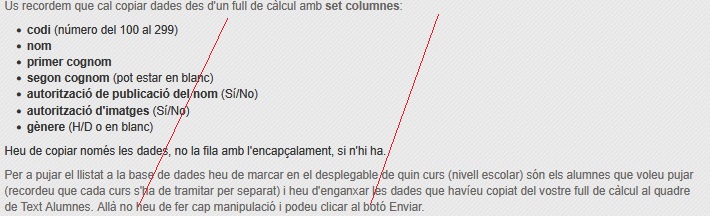 - Teniu les indicacions tècniques sobre la preparació del llistat a les instrucccions generals (enviades al centre, i a la web en aquest enllaç) i també, quan obriu el formulari per fer la pujada d'alumnes us les recordarà:així com podeu veure